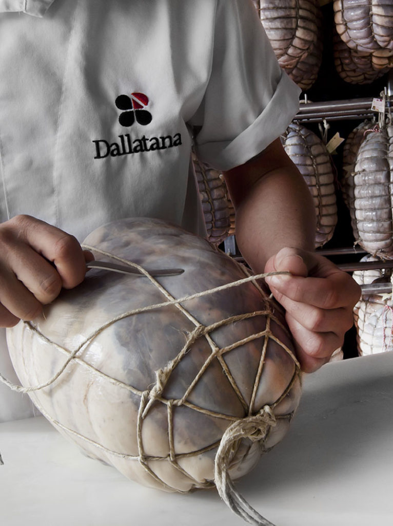 Selezioniamo solo cosce intere di suini nati, allevati e macellati in Emilia Romagna e Lombardia. Ne controlliamo origine, peso e marezzatura; attraverso il tatuaggio impresso sulla cotenna, verifichiamo età e provenienza del suino. Scotennamento, disosso e sezionamento non sono operazioni affidate ai macelli esterni, ma sono eseguite a mano internamente all’ azienda dai nostri esperti norcini, ogni settimana. Facciamo la differenza perché l’eccellenza del Culatello di Zibello DOP Dallatana nasce prima di tutto da un controllo rigoroso della materia prima.